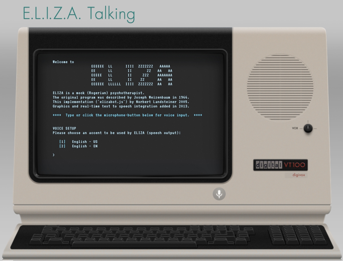 ... Eliza (the "fake" Rogerian psychoanalyst), and Parry afterwards (the "fake" parnoid schizophrenic) - if curious see When Parry Met Eliza: A Ridiculous Chatbot Conversation From 1972 reported in The Atlantic, June 9, 2014 - started one of the most interesting lines of research in the area of Artificial Intelligence (AI).